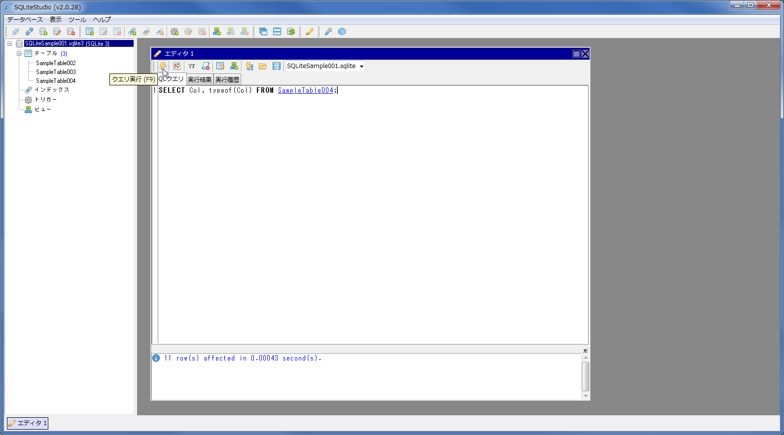 1.「SQLiteStudioでSQLを実行する方法」の手順で、以下のSQLを実行。